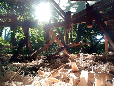 Bramble clearing and tree-pruning in the young plantation areas. Construction of a dead hedge. Floor renovation in the utility shelter using wood chippings. Construction of two new benches for the utility shelter Replacing the old board-walk with a wider one constructed from Sallerton Wood and Kelly House Oak. A big thank-you from the Sallerton Wood Team to all of you who helped during this week. | |